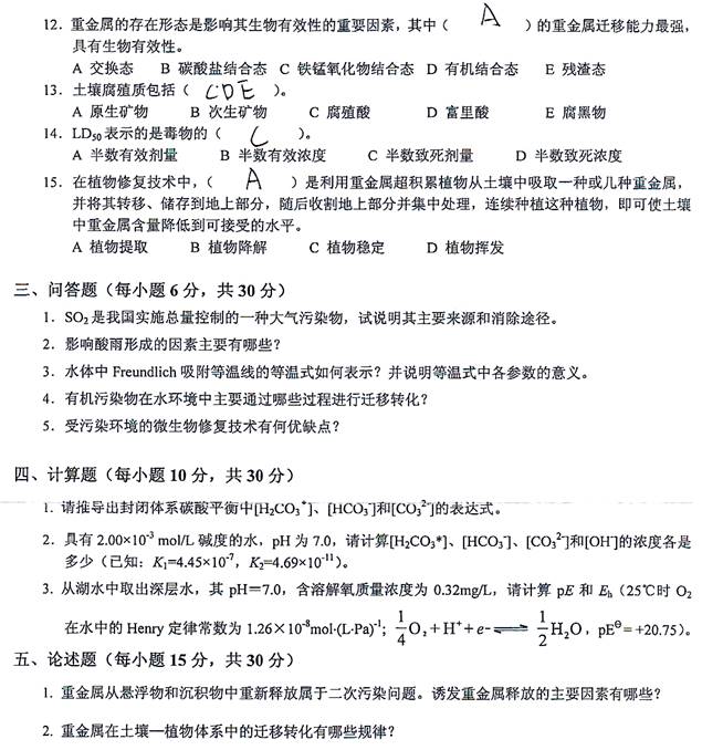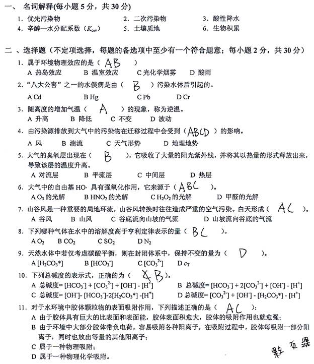 2. 全国名校环境化学考研真题汇总(含部分答案)