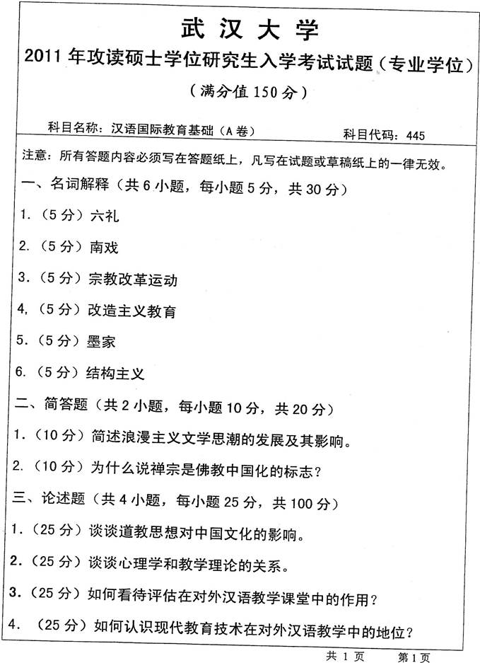 2011年武汉大学文学院445汉语国际教育基础[专业硕士]考研真题