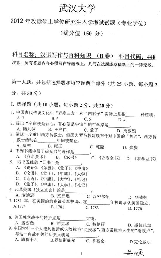 2012年武汉大学外国语言文学学院448汉语写作与百科知识[专业硕士]考研真题