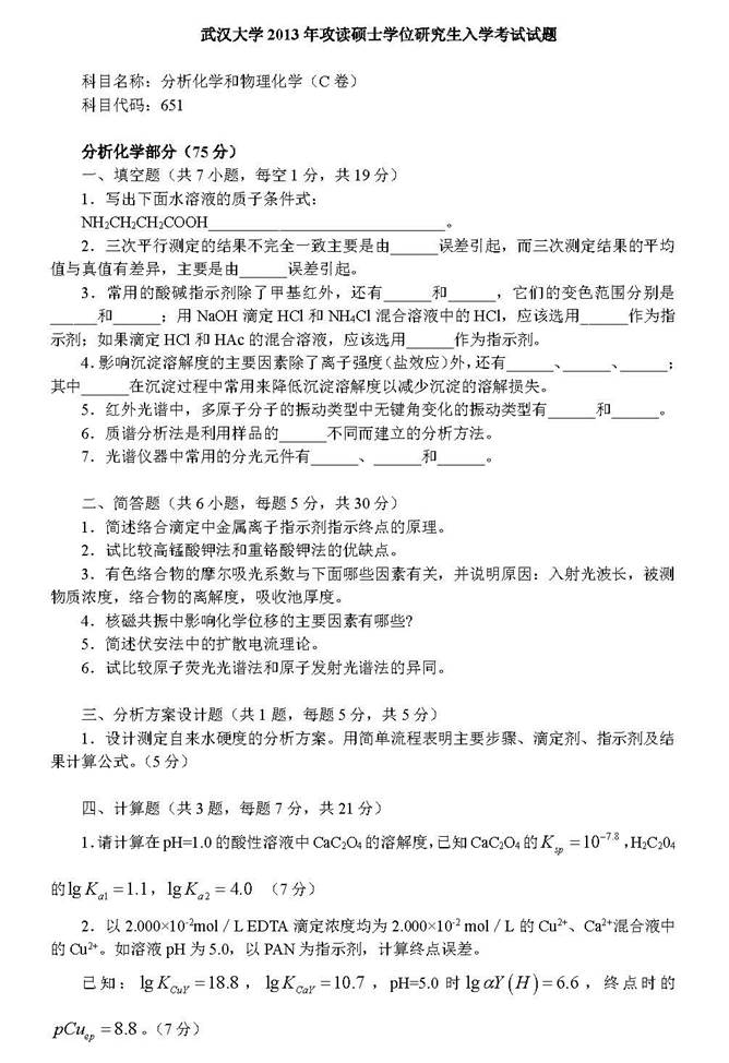 1. 武汉大学《655分析化学和物理化学》历年考研真题汇总(含部分答案)