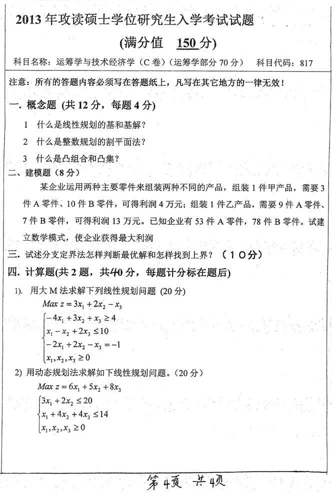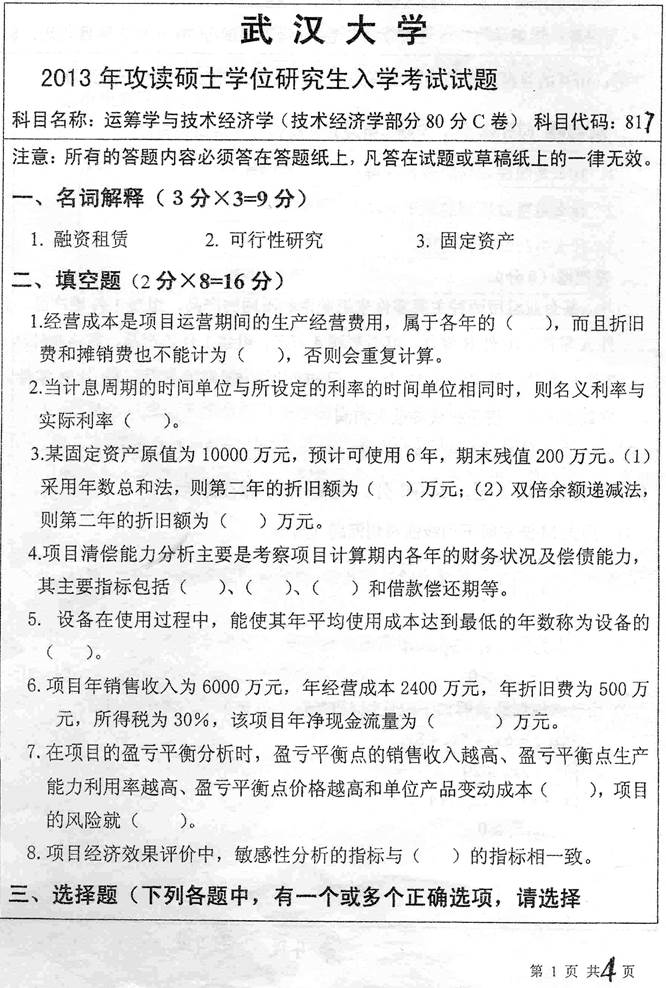 2013年武汉大学经济与管理学院817运筹学与技术经济学考研真题
