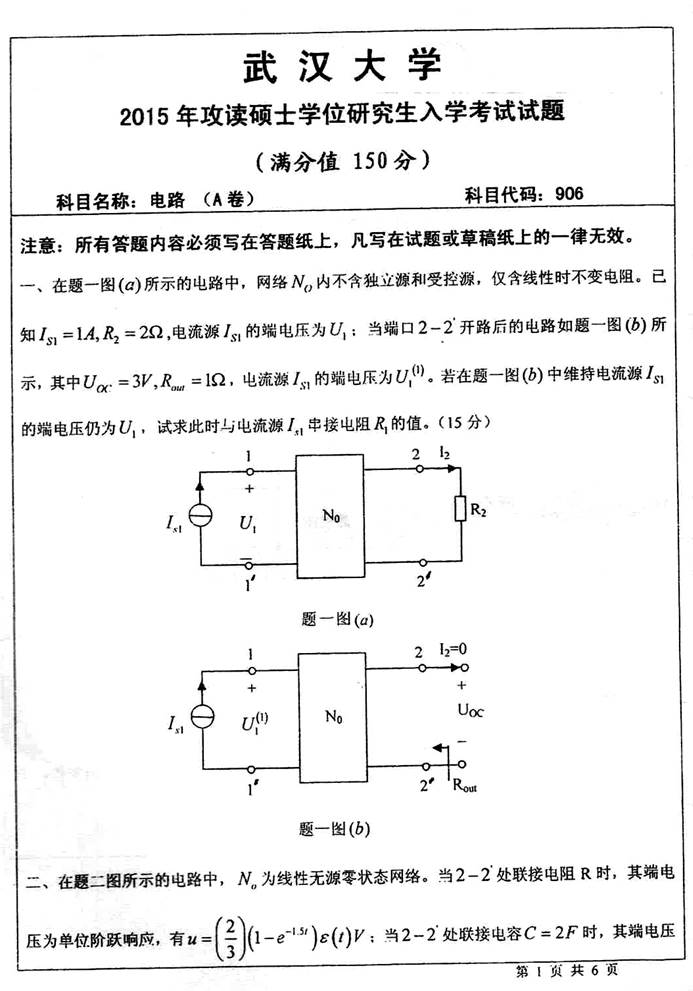 2015年武汉大学906电路考研真题