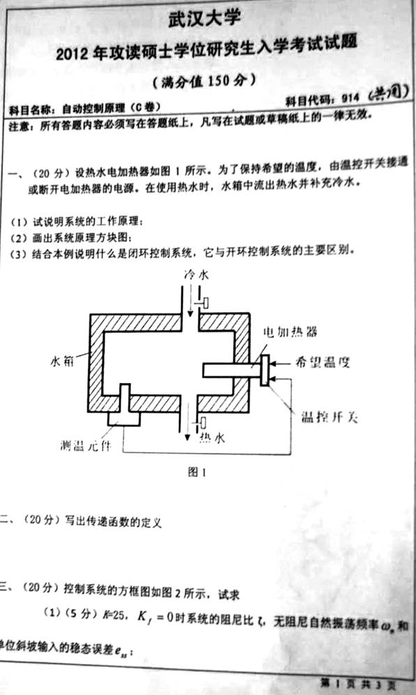 1. 武汉大学动力与机械学院《914自动控制原理》历年考研真题汇总