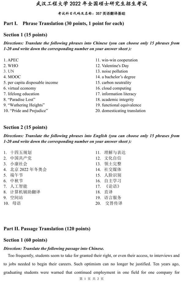 2022年武汉工程大学《357英语翻译基础》考研真题