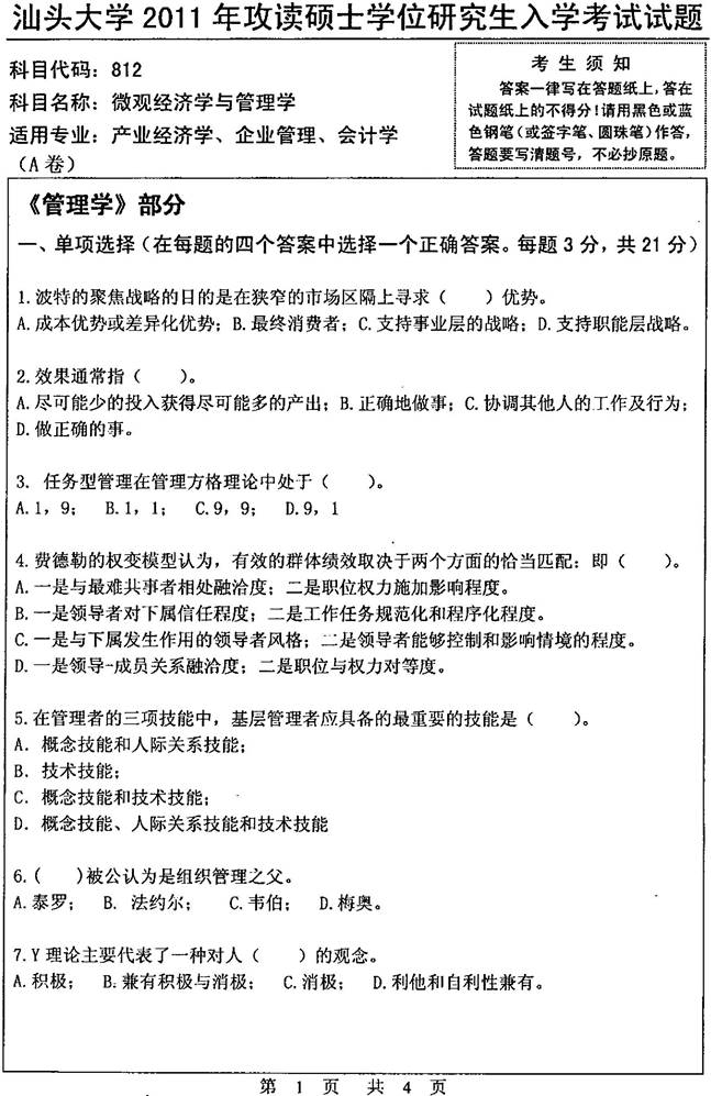 2011年汕头大学《812微观经济学与管理学》考研真题