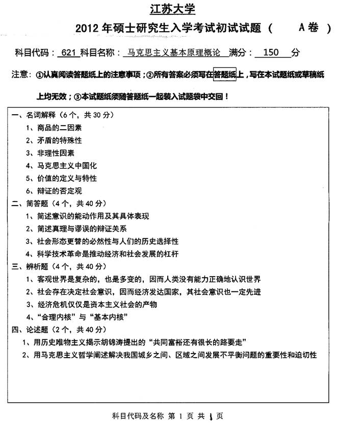 1. 江苏大学马克思主义学院《621马克思主义基本原理》历年考研真题汇总