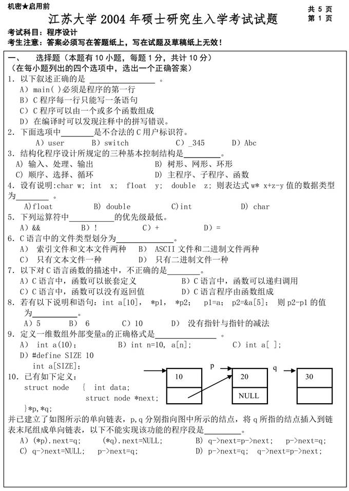 1. 江苏大学《805程序设计》历年考研真题汇总
