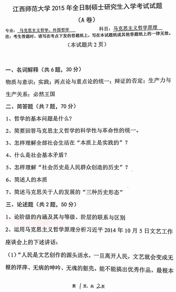 1. 江西师范大学马克思主义学院《701马克思主义哲学原理》历年考研真题汇总