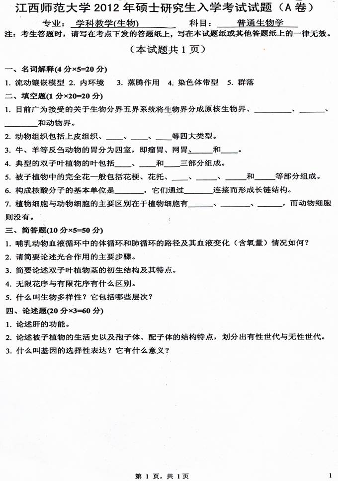 1. [电子书]江西师范大学生命科学学院《826普通生物学》历年考研真题汇总