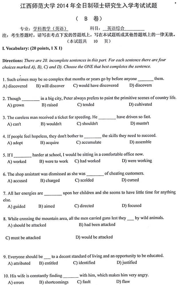 1. [电子书]江西师范大学外国语学院《827英语综合》历年考研真题汇总(含部分答案)
