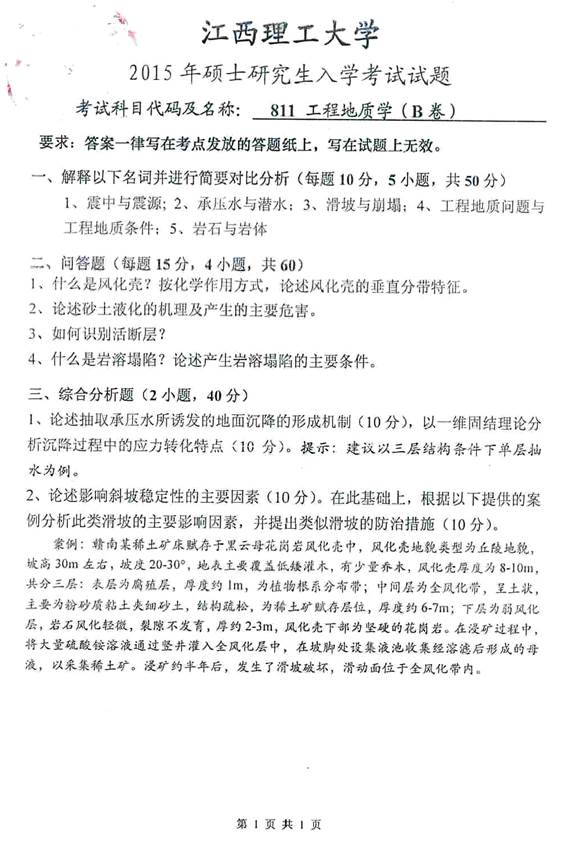 2015年江西理工大学资源与环境工程学院811工程地质学考研真题