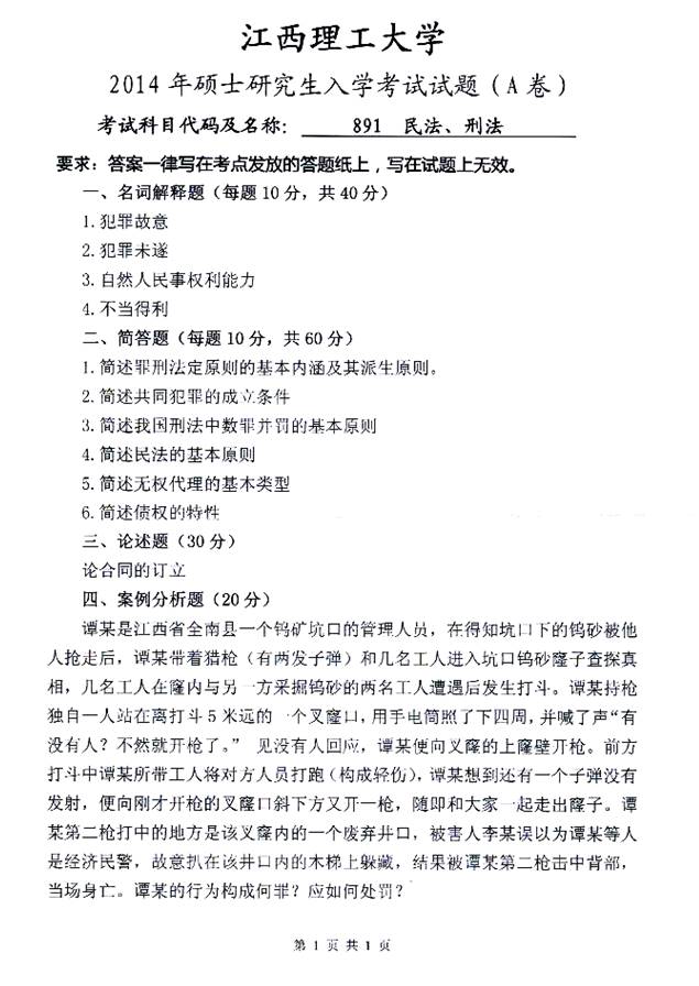 1. 江西理工大学文法学院《891民法、刑法》历年考研真题汇总