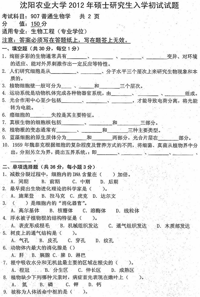 1. 沈阳农业大学生物科学技术学院《627普通生物学》历年考研真题汇总