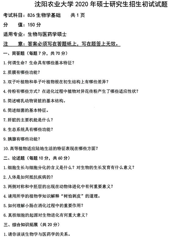 2020年沈阳农业大学《826生物学基础》[专业硕士]考研真题