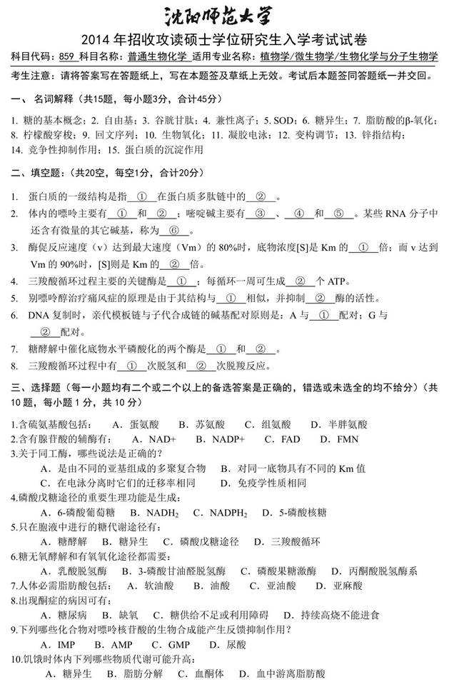 1. 沈阳师范大学化学与生命科学学院《普通生物化学》历年考研真题汇总
