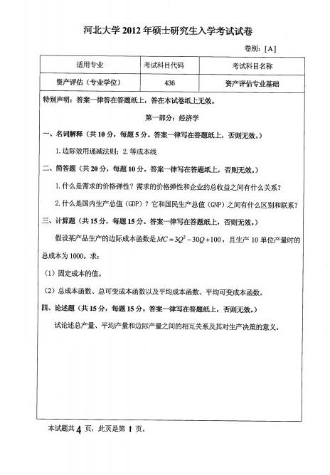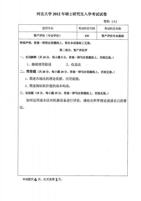 2012年河北大学《436资产评估专业基础》考研真题详解