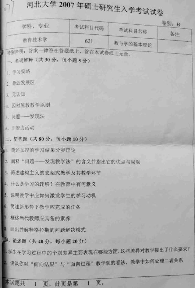 2007年河北大学教育学院621教与学的基本理论考研真题