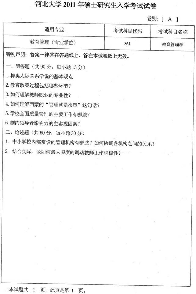 1. 河北大学教育学院《933教育管理学》[专业硕士]历年考研真题汇总