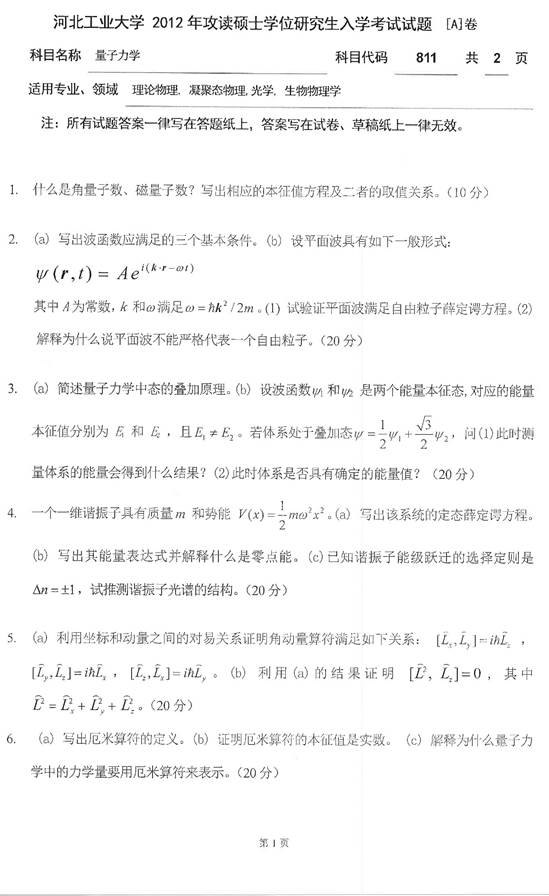 1. 河北工业大学理学院《811量子力学》历年考研真题汇总