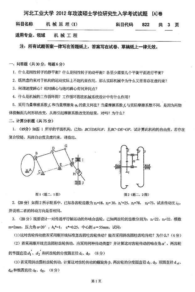 2012年河北工业大学822机械原理(Ⅰ)考研真题