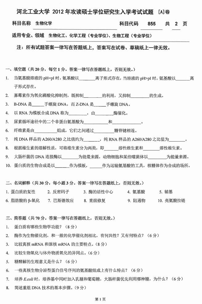 2012年河北工业大学855生物化学(A卷)考研真题