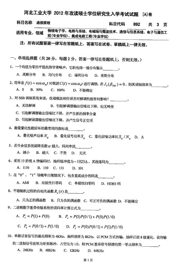 2012年河北工业大学892通信原理考研真题