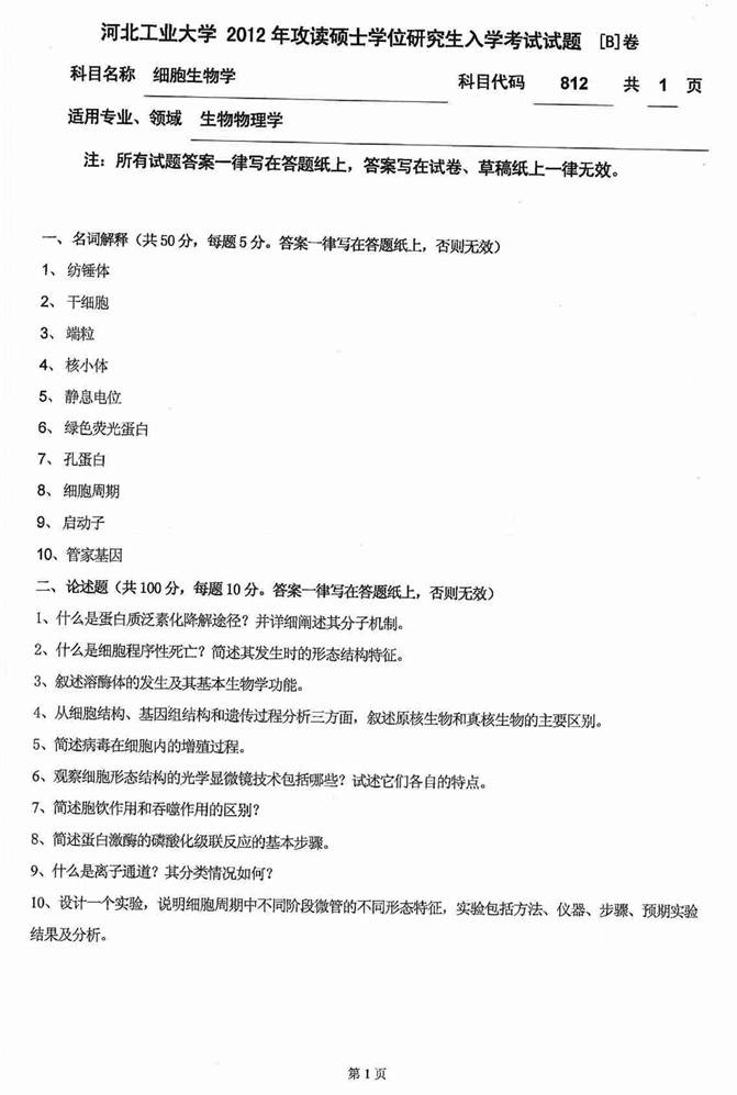 2012年河北工业大学812细胞生物学(B卷)考研真题