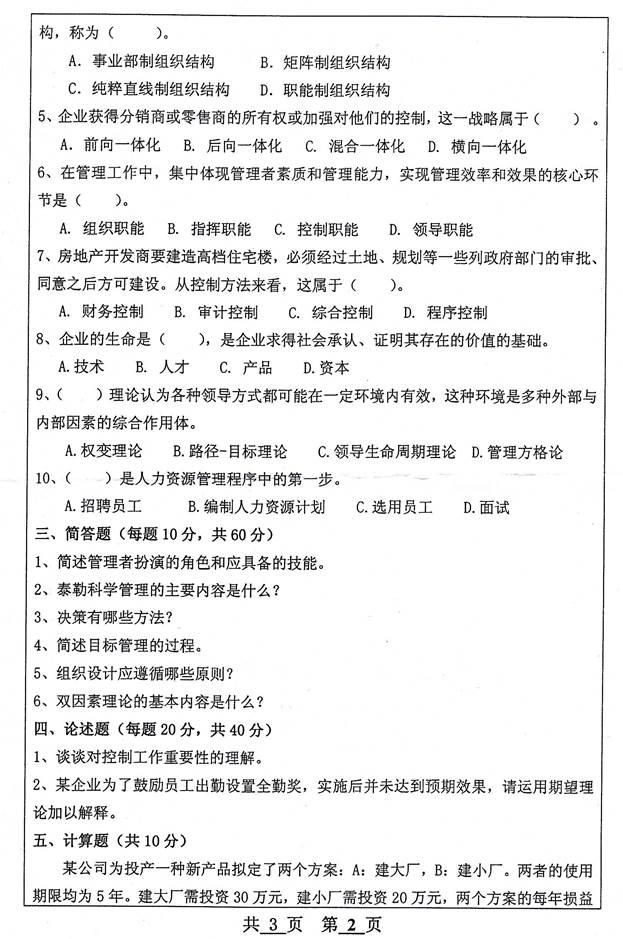 1. 河北工程大学管理工程与商学院《管理学》历年考研真题汇总