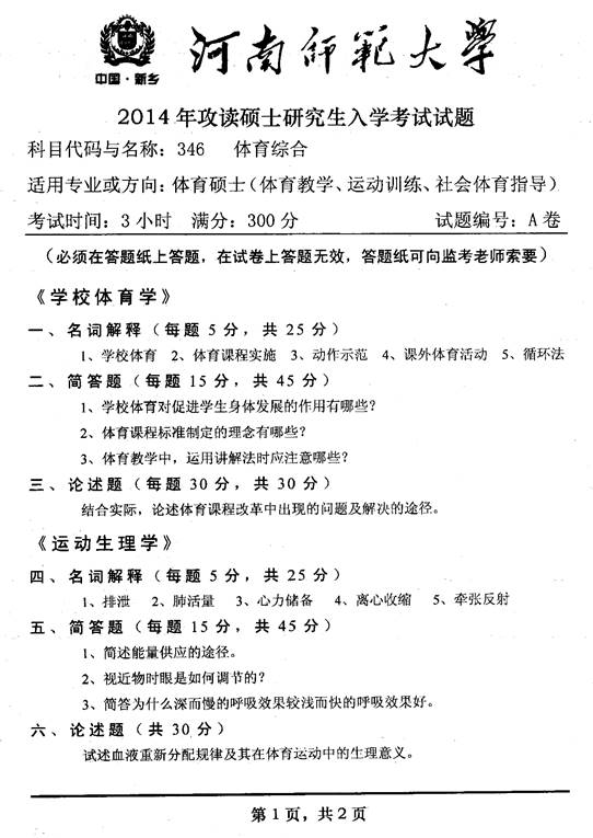 2014年河南师范大学346体育综合[专业硕士]考研真题
