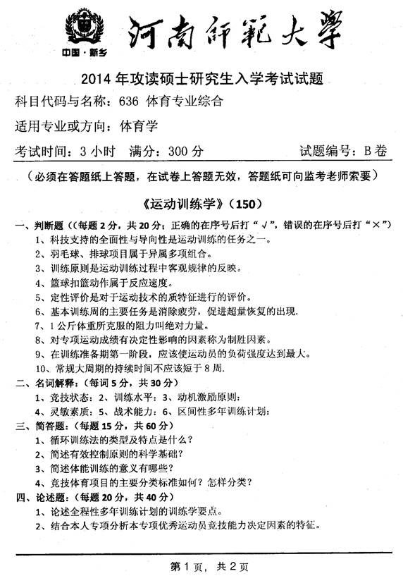 1. 河南师范大学体育学院《636体育专业综合》历年考研真题汇总