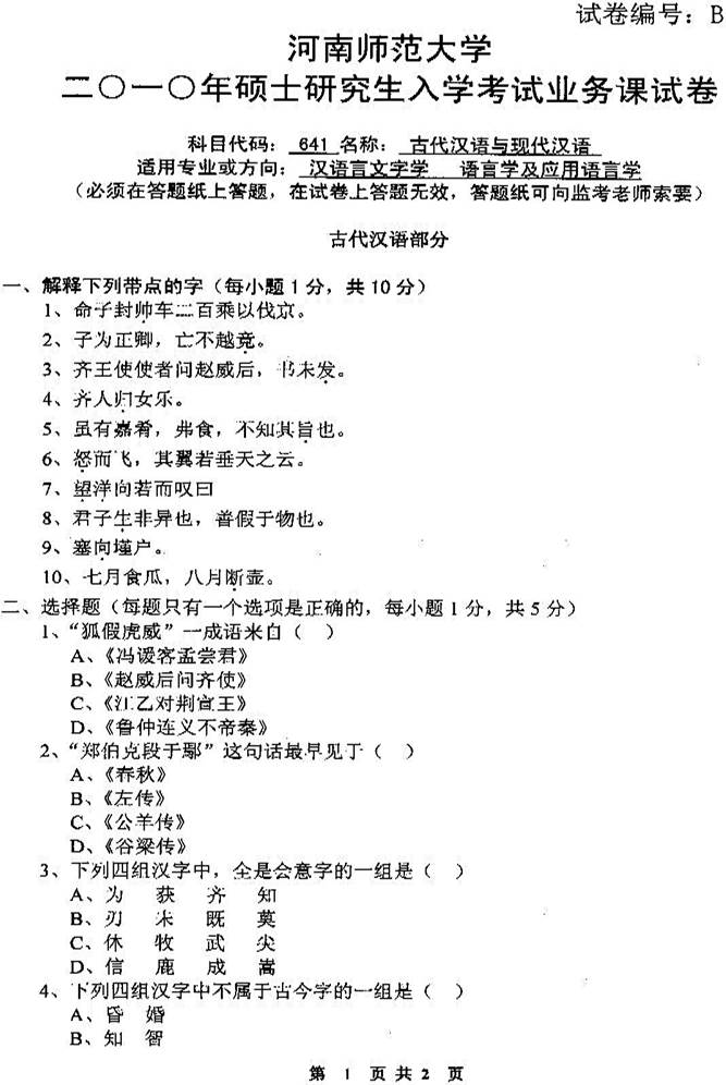 1. 河南师范大学文学院古代汉语与现代汉语历年考研真题汇总