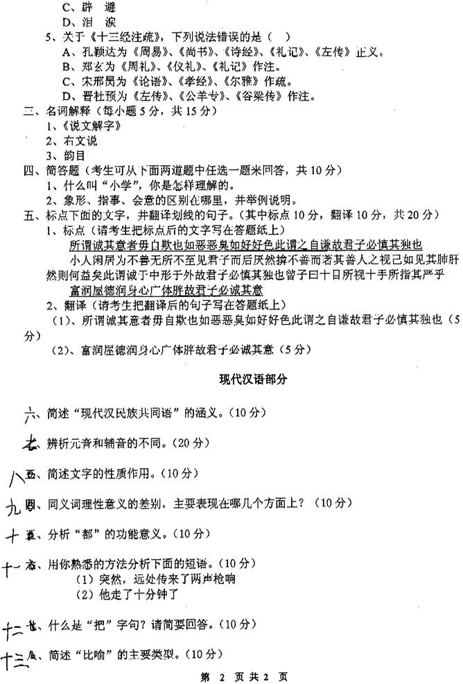 2010年河南师范大学文学院古代汉语与现代汉语考研真题