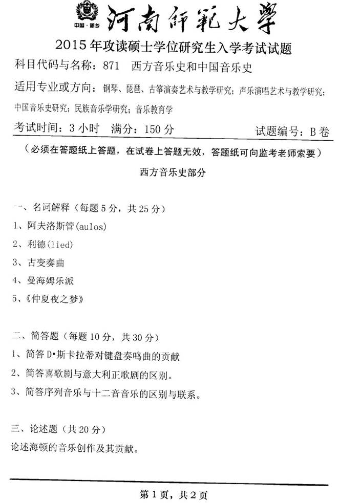 2015年河南师范大学音乐舞蹈学院871西方音乐史和中国音乐史考研真题