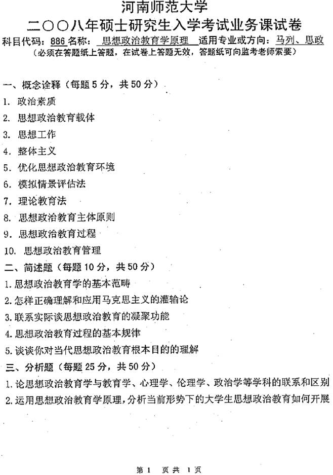 1. 河南师范大学马克思主义学院《881思想政治教育学原理》历年考研真题汇总