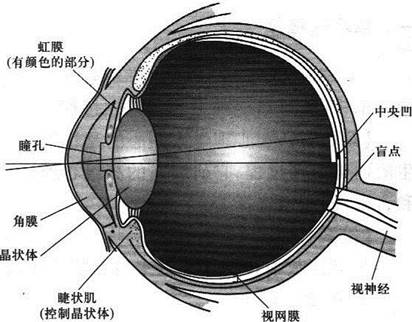 【解析】视觉的器官是眼球(如图),按功能可分为折光系统和感光系统两部分。折光系统包括角膜、水晶体、玻璃体等,它的功能是将外界物体所反射的散光聚集在视网膜上形成一个清晰的物像。感光系统是视网膜,其外层是视细胞层,视细胞是直接感受光刺激并将其转换成神经冲动的光感受器。视细胞分视杆细胞(选项中棒体细胞)和视锥细胞(选项中锥体细胞),前者感受弱光,后者感受强光和色光。因此答案选C。