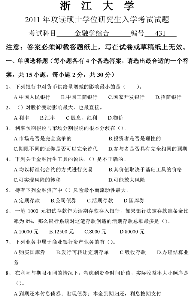 2011年浙江大学经济学院431金融学综合[专业硕士]考研真题