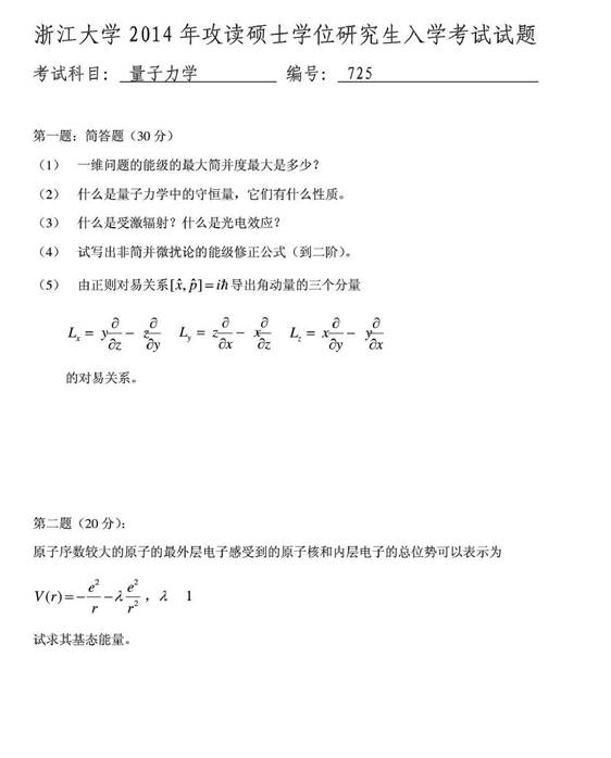 1. 浙江大学《725量子力学》历年考研真题汇总