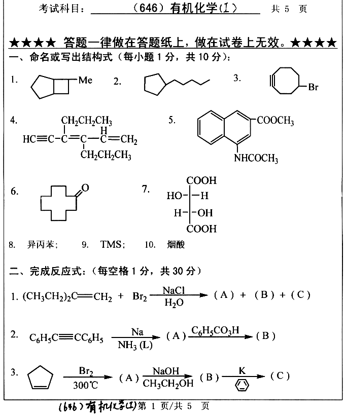 1. 浙江工业大学化学工程学院《646有机化学(Ⅰ)》历年考研真题汇总