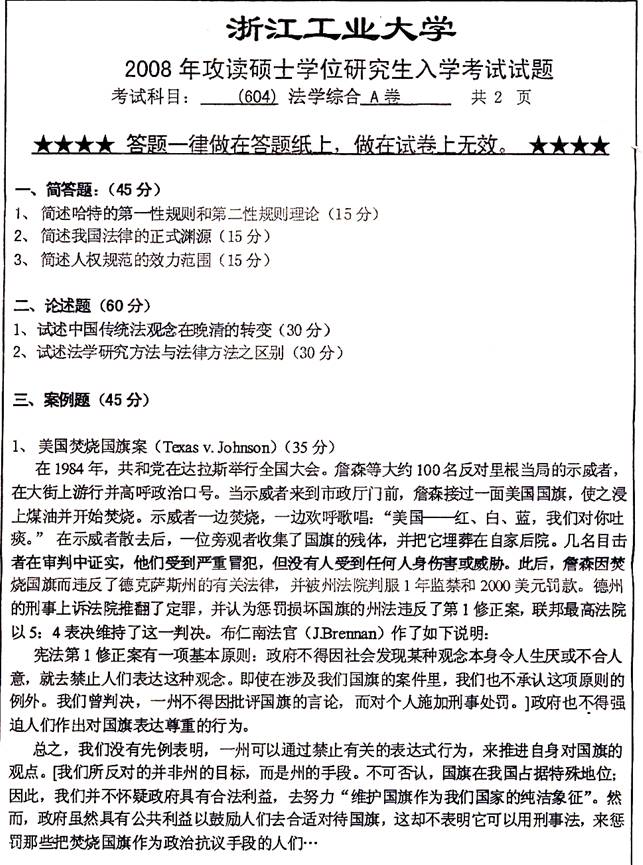 2008年浙江工业大学法学院《604法学综合》考研真题