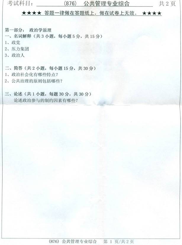 1. 浙江工业大学公共管理学院《876公共管理专业综合》历年考研真题汇总