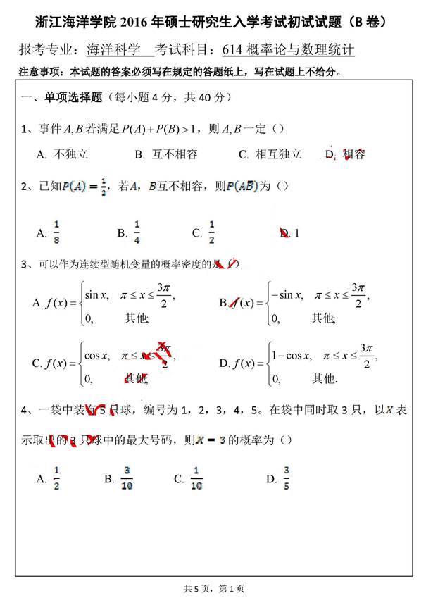 1. 浙江海洋大学《概率论与数理统计》历年考研真题汇总