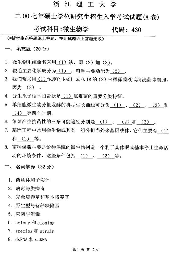 2007年浙江理工大学430微生物学考研真题(A卷)