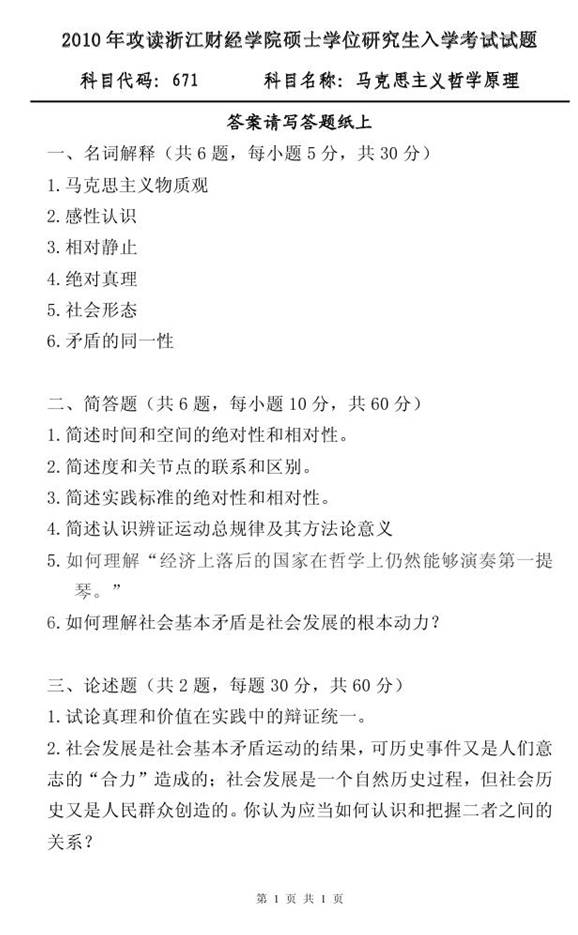 2010年浙江财经学院《671马克思主义哲学原理》考研真题