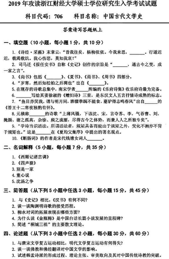 2019年浙江财经大学《中国语言文学综合》考研真题
