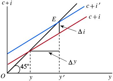 (2)乘数效应可用图2来表示。在图2中,c+i表示原来的总支出线,c+i′表示新的总支出线,i′=i+∆i,原来的均衡收入为y,新的均衡收入为y′,∆y=y′-y。可以看出,∆i<∆y。