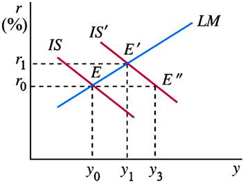 如图1所示,假设经济初始均衡点是曲线IS与LM交点E点,此时市场利率是r0,产出是y0。若采取扩张性财政政策,使IS曲线右移到IS′位置。若不存在挤出效应,即新的均衡点是E″点,市场利率不变,扩张性财政政策使国民收入增加到y3。但是存在挤出效应,即新的均衡点是IS′与LM交点E′点,市场利率上升到r1,扩张性财政政策仅使国民收入增加到y1,y1与y3之间的差值就是挤出效应。