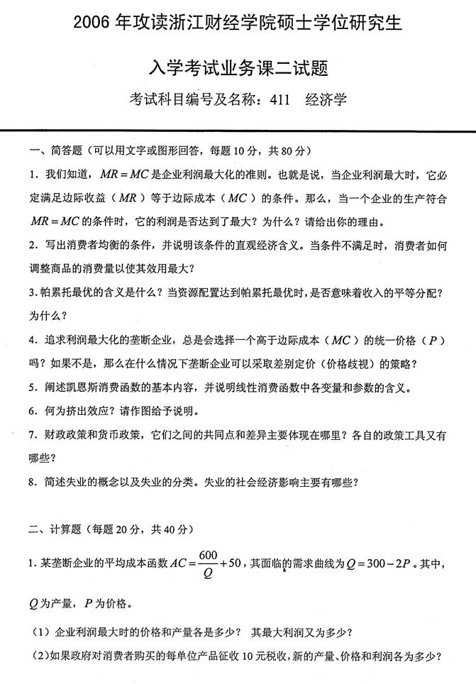 2006年浙江财经学院《411经济学》考研真题