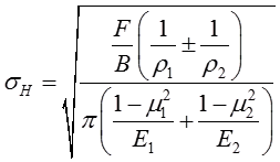 此式对于两个圆柱体同样适用,故其接触应力σH1=σH2