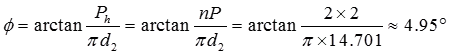 11有一双线螺纹尺寸为:大径d=16mm,中径d2=14.701mm,小径d1=13.835mm,螺距P=2mm,则螺纹升角ϕ为(  )。[扬州大学2021研]