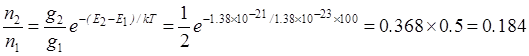 9假定某原子的电子态有两个主要能级,即基态和第一激发态,能级差为1.38×10-21J,其余能级可以忽略,基态是二重简并的。则在100 K时,第一激发态与基态上的原子数之比为( )。[中国科学技术大学2010年研]